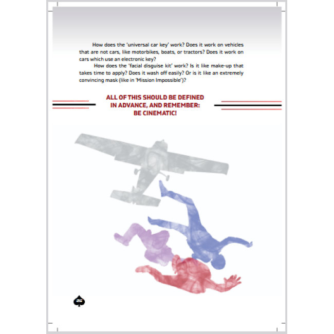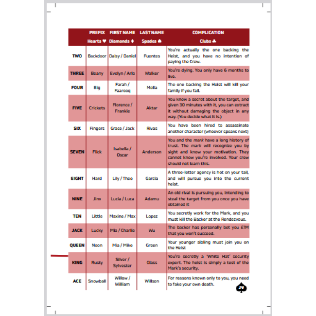 Materials: Each participant needs a standard deck of playing cards (inc. Jokers) and a Playersheet for organizing their cards and statistics. You’ll also need a way to record how you organize the heist.