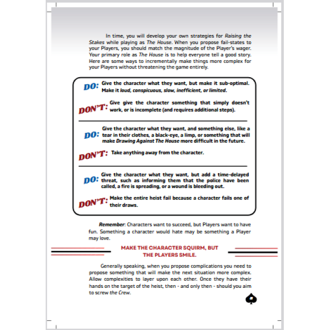 This game is about stealing expensive stuff from undeserving people in competent and dramatic ways. Once you have successfully obtained your target, things will probably go to hell. All the slips, compromises, and risks you took obtaining the target will rain upon you. It’s very possible that not all characters will survive.