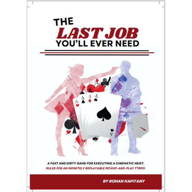 The Last Job You’ll Ever Need is a Table-Top Role-Playing Game (TTRPG) modelled on the Heist genre of movies. Each Player uses a standard deck of playing cards to create characters, and determine their strengths and weaknesses. Then one person will draw additional cards to reveal the nature of the heist: what you’re attempting to steal, from whom, and where it’s located.