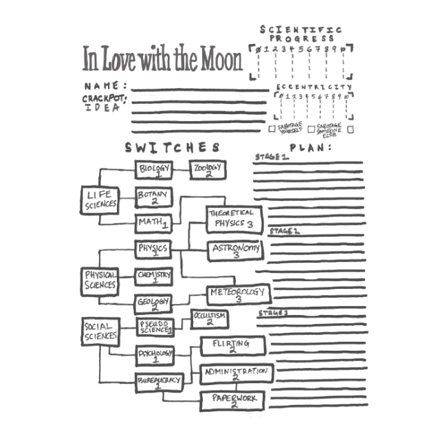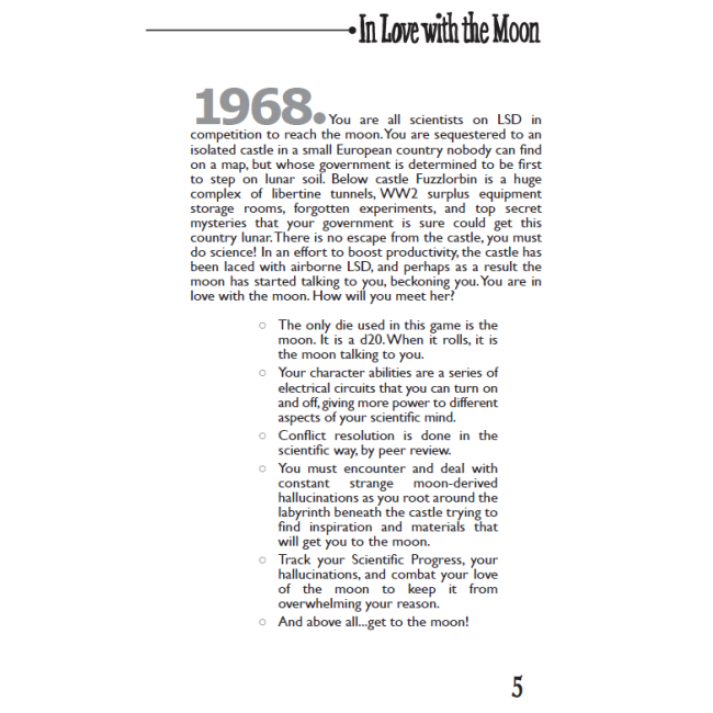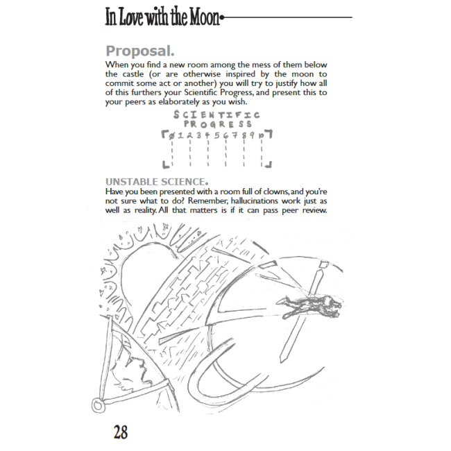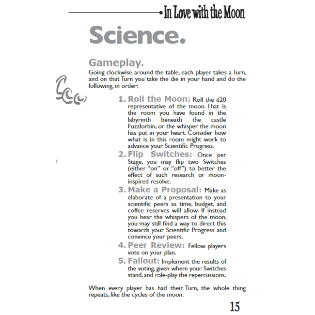 Conflict resolution for this game uses the scientific method—a soul-crushing peer review process. It ultimately rewards politicking more than science itself. The only dice in the game is a single d20, as representative of the moon herself.