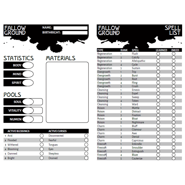 Fallow Ground is a table-top roleplaying game that draws from the folklore of the lowlands. Spells are open-ended and combat is deadly. There are no levels, but your statistics improve as you purge horrors and rot.