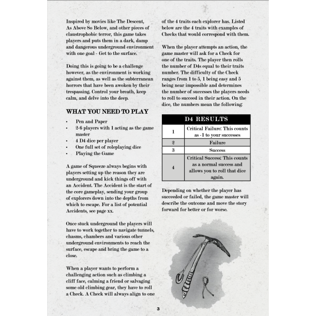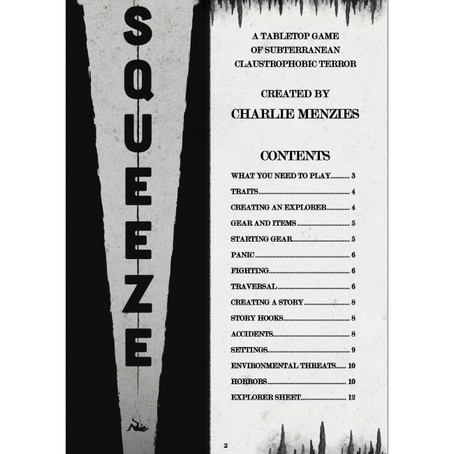 Doing this is going to be a challenge however, as the environment is working against them, as well as the subterranean horrors that have been awoken by their trespassing. Control your breath, keep calm, and delve into the deep. Squeeze is a dark and foreboding 12pg OSR Roleplaying Game zine in A5 booklet.
